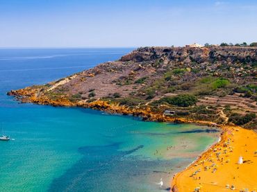 You will enjoy this sandy beach and the crystal clear water, with views of Comino island. For people who want to have more fun, you can also jump off from the rocks !